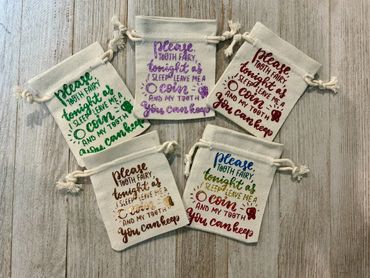 Tooth Fairy bags are a fun way to collect from the tooth fairy. Bags are 3x4 inches and your choice of color font.